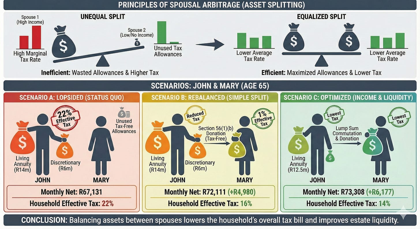 We can push this further. Discretionary capital is more tax-efficient than Living Annuity income (which is taxed as pure salary). John commutes a portion of his Living Annuity (taking a lump sum) and moves that capital into Mary’s discretionary portfolio.
